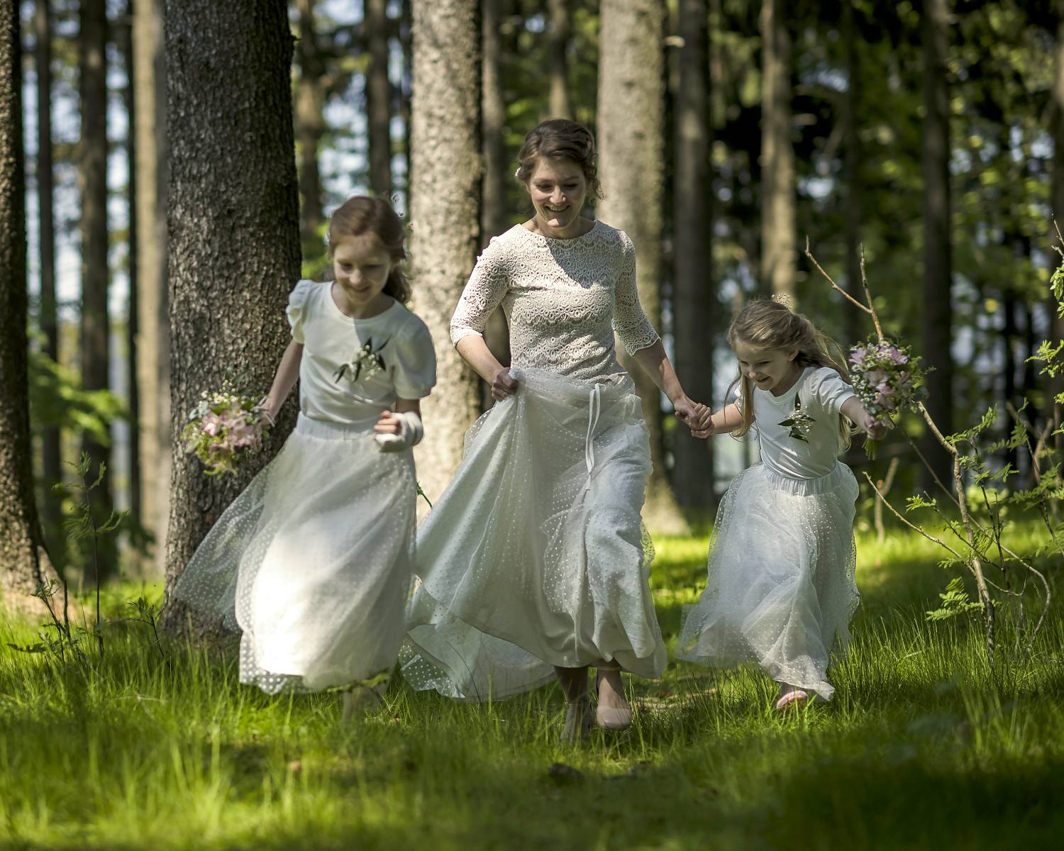 Svatba a troje šaty. Až na tyl zcela bavlněné modely a to včetně krajky. Družičky mají obě sukně sešité nahoře do pasu a gumy.
