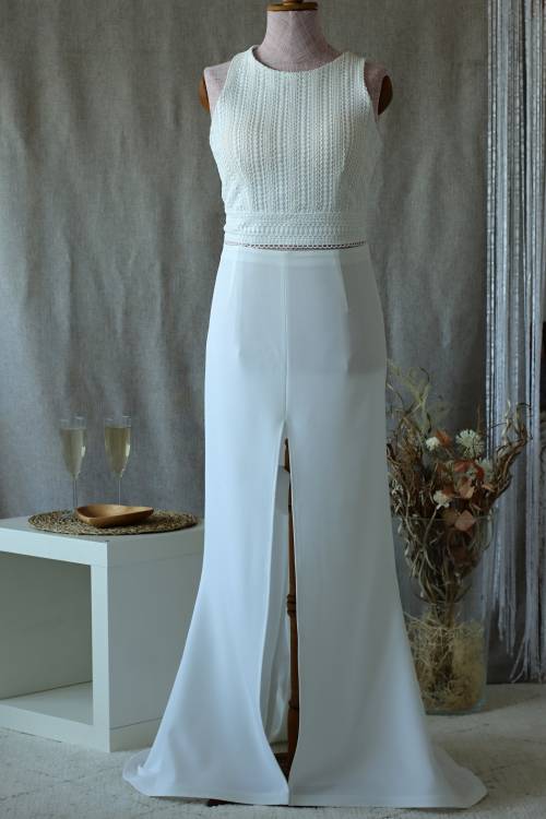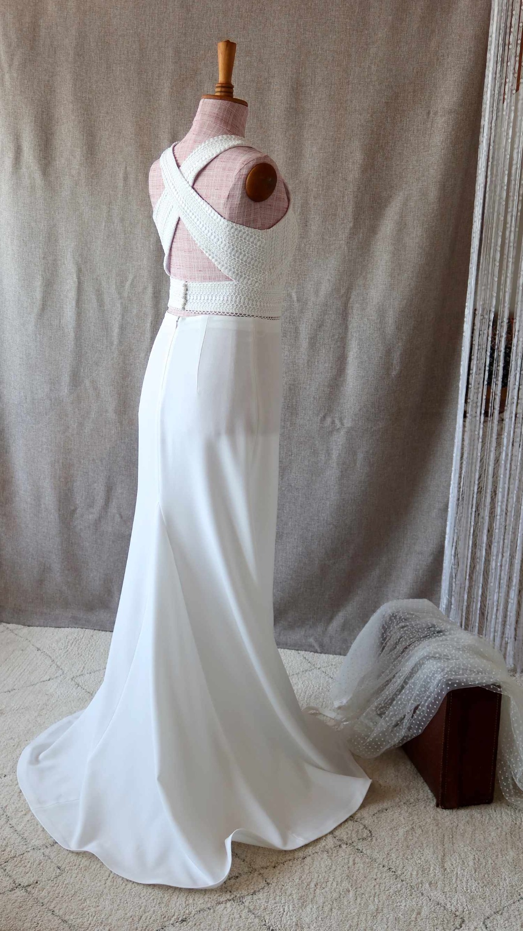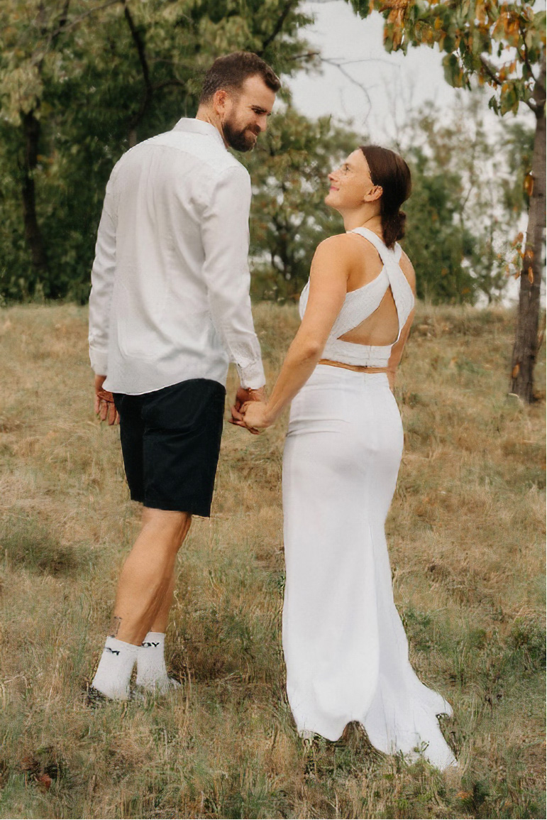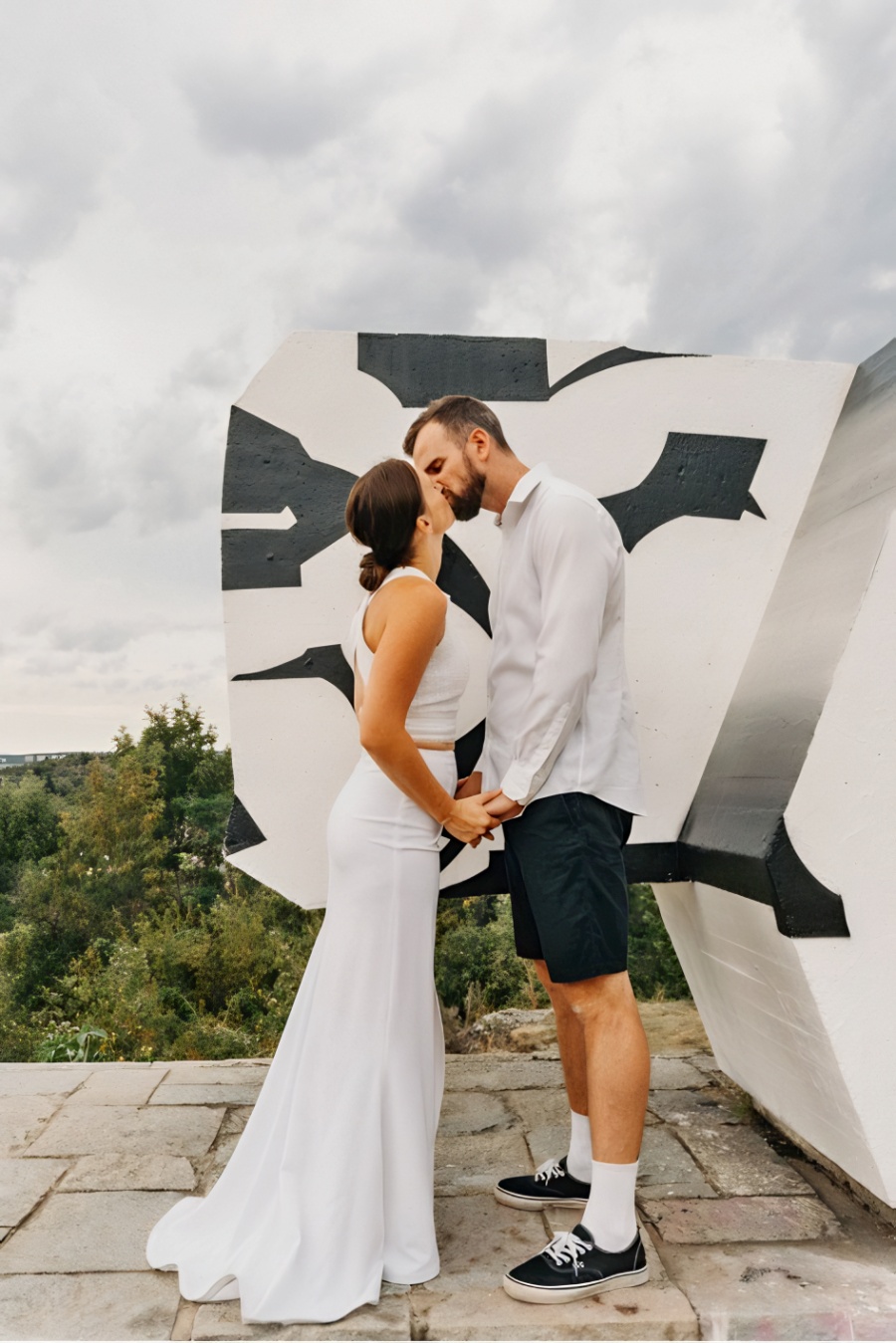 Protagonisté - taneční pár a fitness. Speciální top pro nevěstu z portugalské krajky a sukně, která nevadí výrazovému tanci.